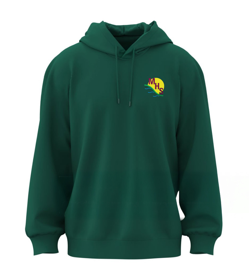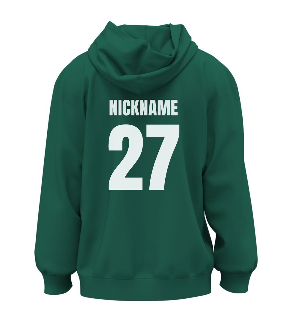 A dark green, 330GSM Premium Brushed Fleece Hoodie with a kangaroo pocket, embroidered logo to the left hand side of the chest, vinyl heat pressed number and case sensitive nickname on the back.